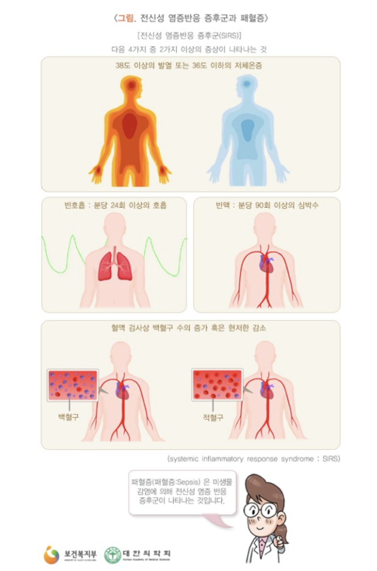 38도 이상의 고열 혹은 36도 이하의 저체온증, 호흡수 증가, 심박수 증가, 백혈구 수치의 이상 등의 증상을 동시에 수반하는 경우를 말합니다.